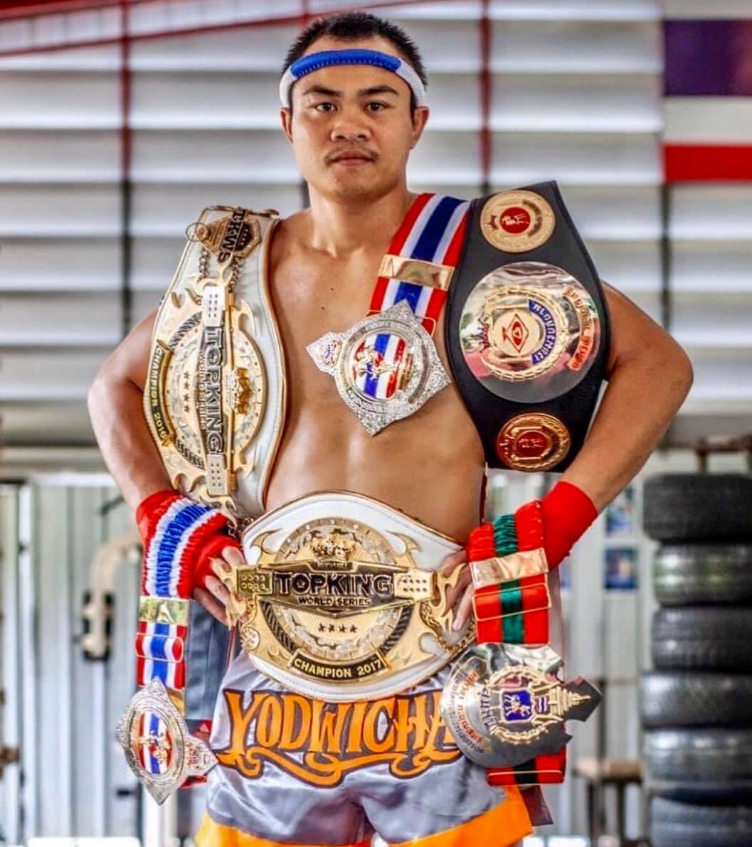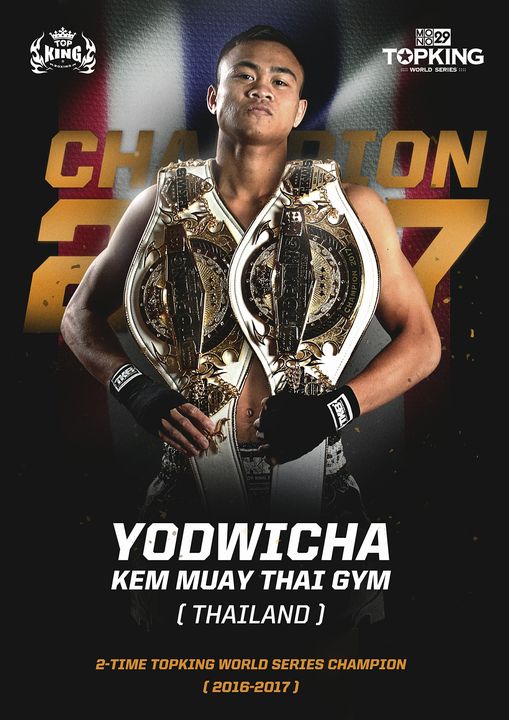 Yodwicha is a two-time 'Topking World Series' tournament champion in 2016 and 2017. He won his first championship belt by decision against the Russian fighter Arbi Emiev, and his second by knockout against the German fighter Pascal Schroth.